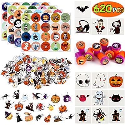 Over 600 Pcs Halloween Party Favors Toys Bulk, Including Halloween Colorful Sticker Sheets Stampers Foam Stickers temporary Tattoos for Kids