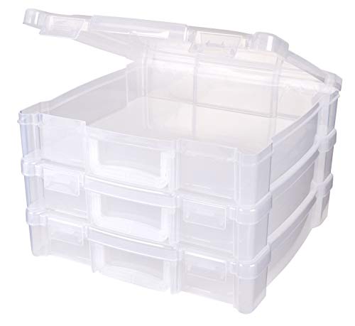 This 3-Pack of ArtBin 12 x 12 Storage Box with Handle provides the perfect solution for storing your art and craft supplies at one place. These boxes are stackable and have a sturdy handle for easy carrying. The open 1-compartment design is ideal for storing larger supplies such as scrapbook paper, stationary, coloring books, sketch pads, fabric, stamp pads and more. Made of a hard translucent plastic that is durable enough to resist wear & tear. The clear plastic construction provides easy viewing of the contents inside.
