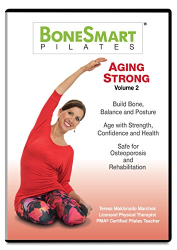 The is the 3nd DVD produced by BoneSmart Pilates and the second in its AGING STRONG series. With the Aging Strong DVD series, your MOVEMENT BECOMES YOUR MEDICINE. This program, created by a physical therapist, targets areas at risk of decline as we age including, but not limited to, the hips and legs, the spine and balance. Two 25 minute time efficient full body workouts will challenge you, yet keep you safe. The workouts move at a challenging pace with modifications offered. They include standing weight-bearing sections with resistance bands and loops to improve your strength and balance, mat sequences for core/spine strength and flexibility and a fun bone building stomping flamenco inspired dance. All workouts are preceded by step by step tutorials to ensure your safety and maximize benefit. Bonus! – Posture Tutorial teaches you how to stand with ease. Safe for osteoporosis and other conditions. The Aging Strong Enhanced Prop Bundle, sold separately, includes everything you need to benefit from this DVD. (alternative exercise equipment that you might already own is discussed in the “Props” section of this DVD) FREE PERK: DVD buyers receive free exclusive access to our private online support page at BoneSmartPilates.com. Here the creator/physical therapist moderates all exercise related questions.