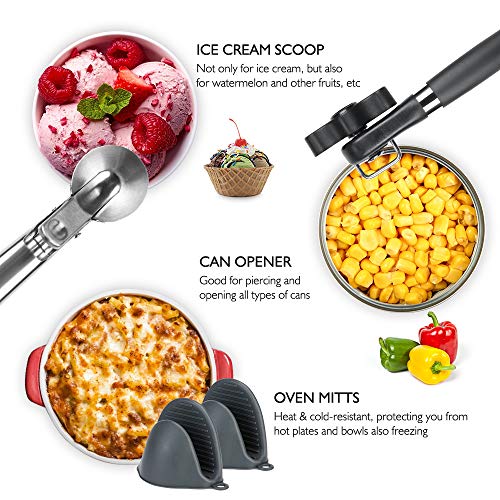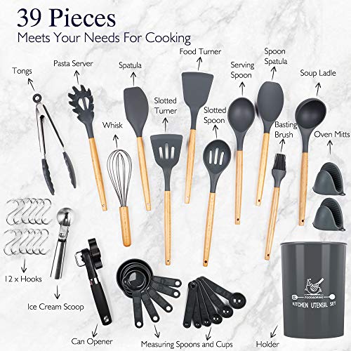 【Complete Professional Kitchen Utensil Set】-39PCs All-in-one Kitchen Utensil Set which includes Whisk, Spoon spatula, Pasta server, Soup ladle, Serving spoon, Food turner, Slotted turner, Slotted spoon, Spatula, Basting brush, Tongs, Ice cream scoop, Can opener, 6+5 Measuring spoons and cups, 2 Silicone oven mitts, 12 Hooks, Holder. All about this cooking utensils can meet your different needs for cooking.