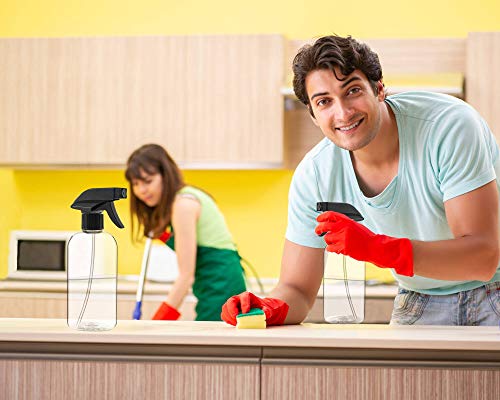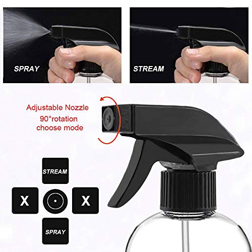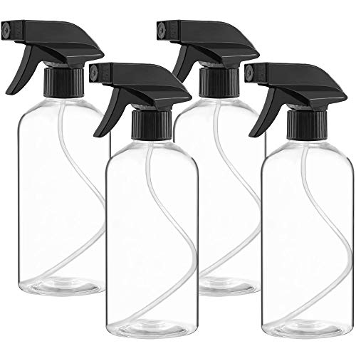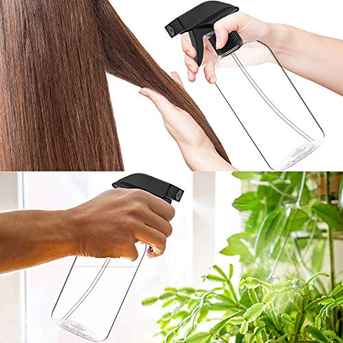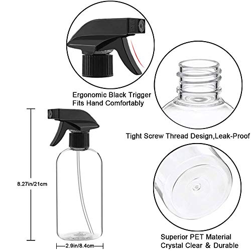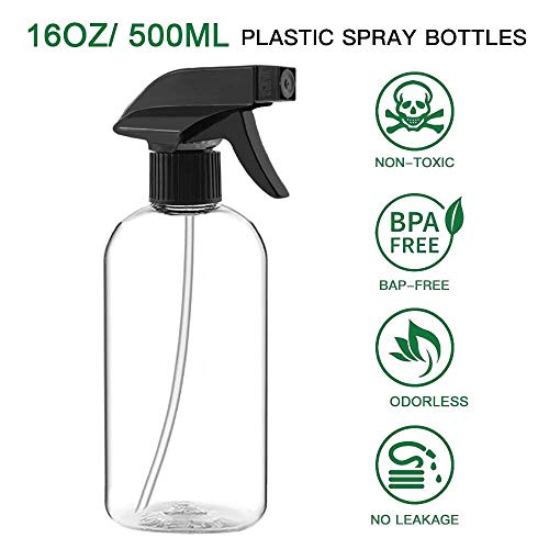 【Superior Material】: Our 4 pack 16oz empty spray bottles are made of food grade recyclable PET plastic, highly transparent, safe and eco-friendly, solid and durable to serve you a long time. Features a tight seal that will prevent any liquids from dripping out. The capacity is large of 16oz/500ml, light weight and easy to carry, ideal containers for cleaning, hair care, travel, gardening and plant.