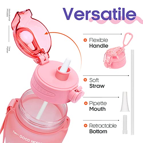 【Distinct Design & Portable】The flip top lid is designed with secure lock make it dust and leak proof.One removable straw allows you to enjoy spill-proof sipping.It can also be used without straw,a dual-purpose water bottle.With a portable wrist strap,hidden loop handle and anti skid grip design,it gives you three ways to carry it to anywhere.Perfect for gym,workout,office and any outdoor recreations.