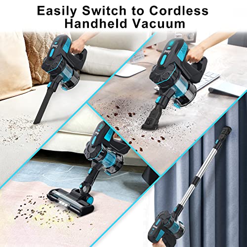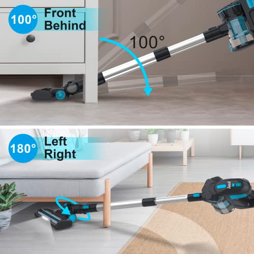 【Flexible LED Motorized Brush Head】The stick vacuum cleaner cordless with LED headlights to illuminate the du-st, debris, and hair under furniture or other hard-to-reach dark corner and track it. Maneuverable 180° swivels sideways and 90°up and down let you clean the du-st under furniture and bed(over 2 inches). Relax your wrist and arm with an ergonomic handle. Bring you the best clea-ning performance and efficiency!