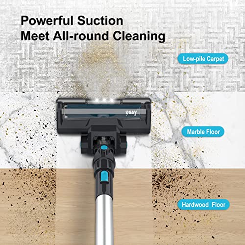 【5-Layer High-Efficiency Filtration System】INSE cordless vacuum is equipped with fully sealed high-efficiency cyclone separation technology and a high-density filtration system that captures up to 99.99% of microscopic du-st particles as small as 0.1 microns without leakage while expels purified fresher air for your family. Cordless stick vacuum eliminates pet hair, fine du-st, debris, dirt, cereal, food residue, large particles and delivers perfect floor-clea-ning performance.
