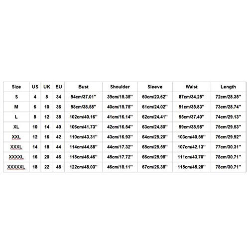 ✈Size:XXXXXL US:18 UK:22 EU:48 Bust:122cm/48.03” Shoulder:46cm/18.11” Sleeve:67cm/26.38” Waist:115cm/45.28” Length:78cm/30.71”