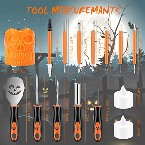 🎃100% AFTER-SALES SERVICE: Lifetime warranty and money back plus our lifetime customer service makes your purchase absolutely risk-free. We also provide 6pcs free carving template and 2 LED pumpkin candles to assist you in carving and creative design.
