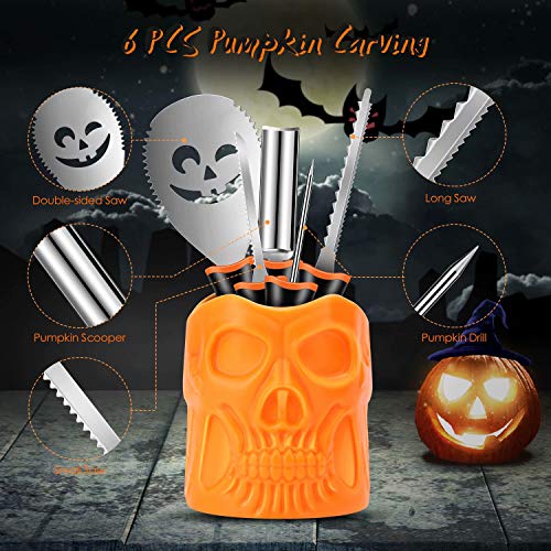 🎃PROFESSIONAL REPRODUCIBLE HIGH-QUALITY TOOLS: The carving tool is made of heavy-duty stainless steel and is mounted in a strong ABS plastic handle. It will not break or slip when carving. Strong and will not rust, it can be reused. After use, the tool can be stored in an orange skull storage carrying bucket. Convenient storage and increase the Halloween air.