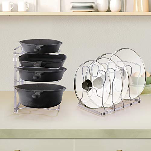 【STURDY CONSTRUCTION】Made of heavy duty metal with non-stick coating to protect your pans from scratching each other. PET anti-slip feet to prevent it from sliding or scratching surfaces